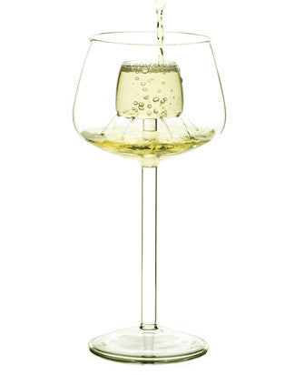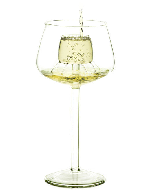 Simply uncork a bottle of wine and pour into the vessel in the center of the glass. The wine will aerate as it showers through. Dishwasher safe.